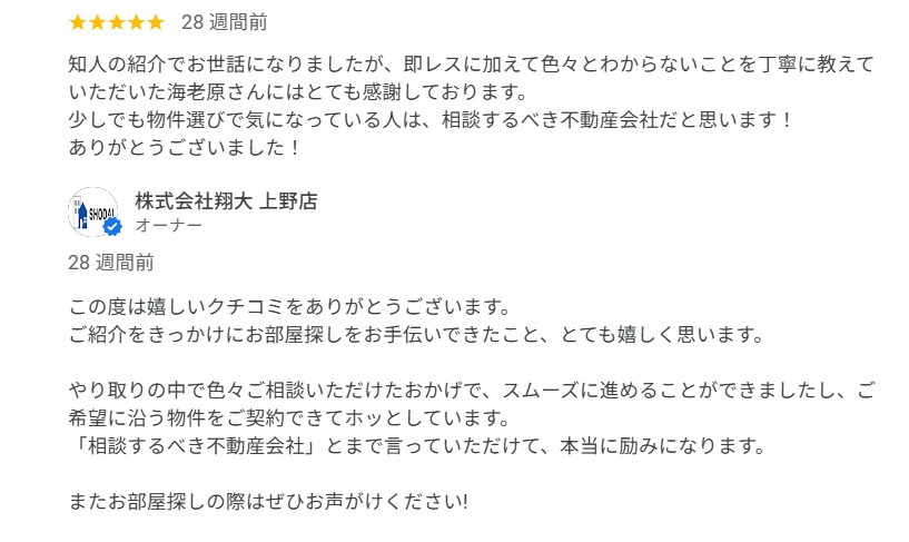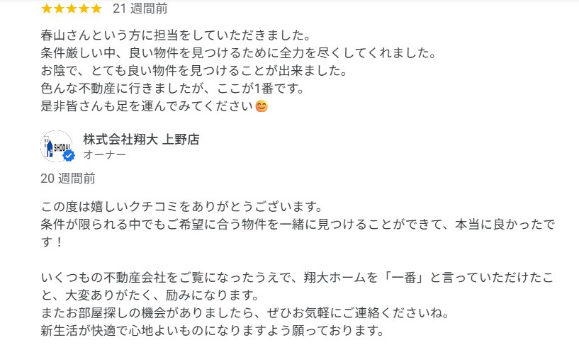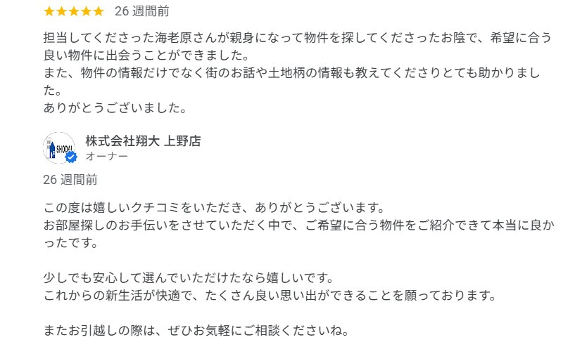 今後ともこの度は翔大ホームにクチコミをお寄せいただき、誠にありがとうございます。