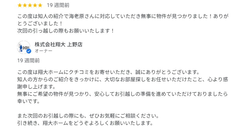 この度は知人の紹介で海老原さんに対応していただき無事に物件が見つかりました!ありがとうございました!